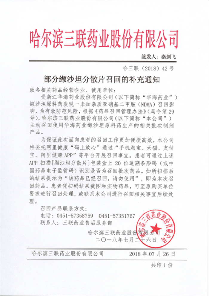 企業(yè)動(dòng)態(tài) 企業(yè)動(dòng)態(tài) 行業(yè)動(dòng)態(tài)新聞中心企業(yè)動(dòng)態(tài)部分纈沙坦分散片召回的補(bǔ)充通知發(fā)布日期:2018-07-27 點(diǎn)擊次數(shù): 次 注:電話咨詢(xún)時(shí)間為工作日8:30-11:30 ,13:30-17:00 上一篇文章下一篇文章
