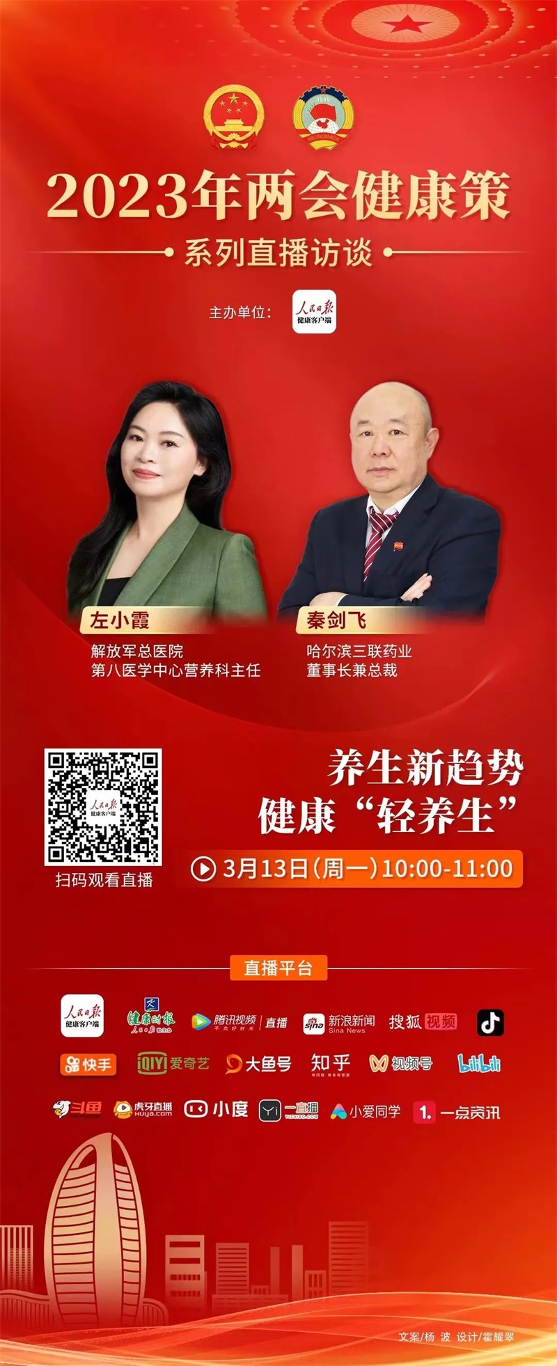 3月13日,人民日報健康客戶端“兩會•健康策”營養(yǎng)健康專場中,黑龍江省人大代表、哈爾濱三聯(lián)藥業(yè)董事長兼總裁秦劍飛;解放軍總醫(yī)院、第八醫(yī)學(xué)中心營養(yǎng)科主任左小霞,做客直播間。