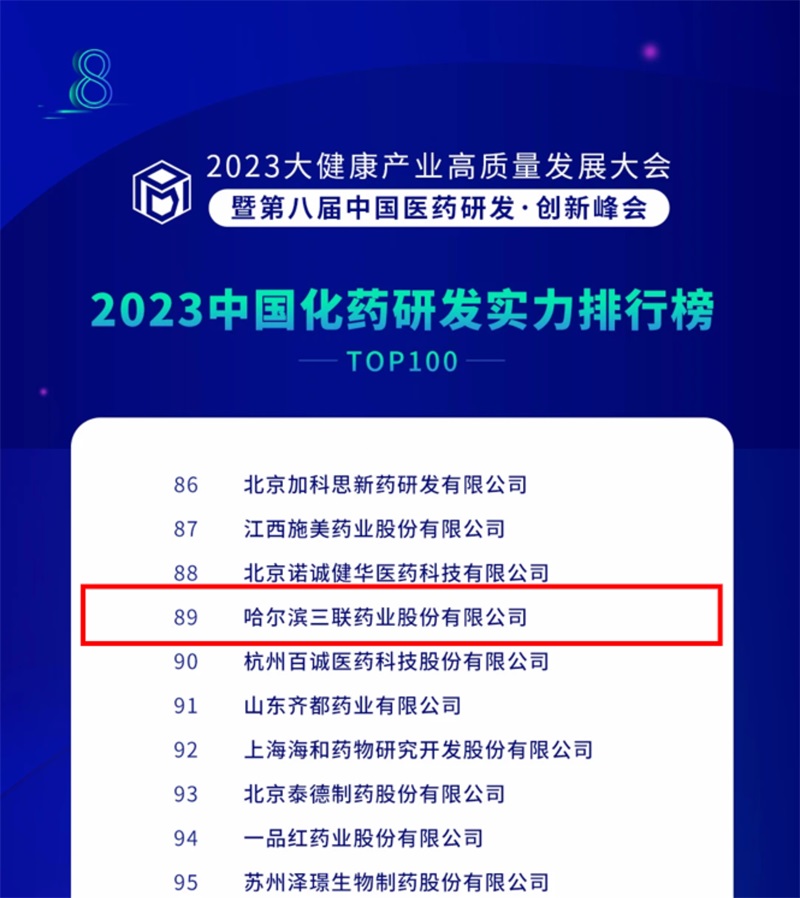哈三聯(lián)躋身“2023中國化藥研發(fā)實力排行榜TOP100”榜單第89位