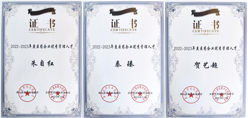 公司董事、質(zhì)量技術(shù)管理中心總監(jiān)朱自紅,總裁助理秦臻,第三事業(yè)部總經(jīng)理賀藝超3人同時榮獲“2022-2023 年度醫(yī)藥企業(yè)優(yōu)秀管理人才”稱號。