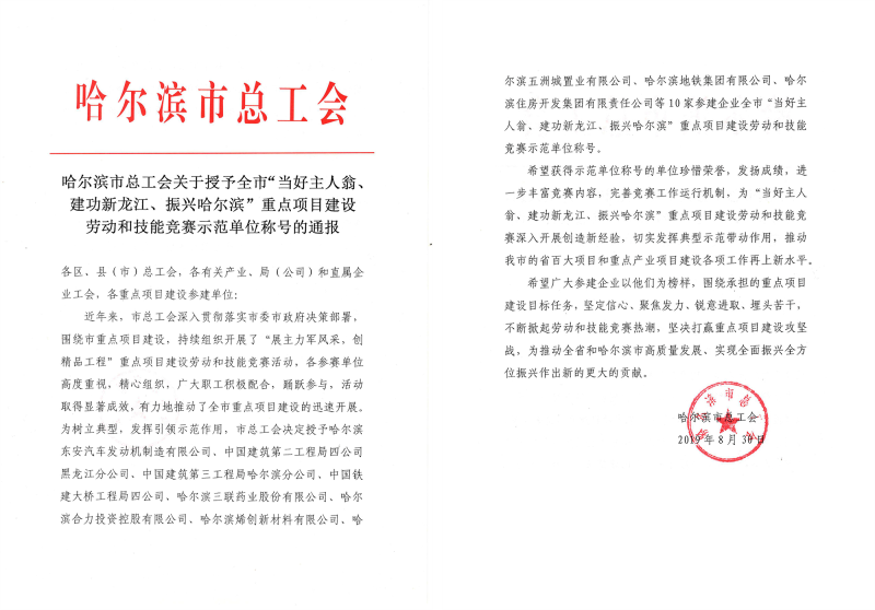 哈爾濱市總工會關(guān)于授予全市“當好主人翁、建功新龍江、振興哈爾濱”重點項目建設(shè)勞動和技能競賽示范單位稱號的通報: