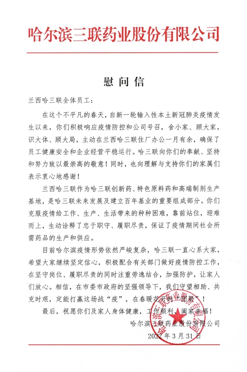秦總希望蘭西哈三聯(lián)全體員工積極配合有關部門做好疫情防控工作,在堅守崗位、履職盡責的同時注重勞逸結合,加強自我防護,以更加健康的體魄靜待春暖花開!