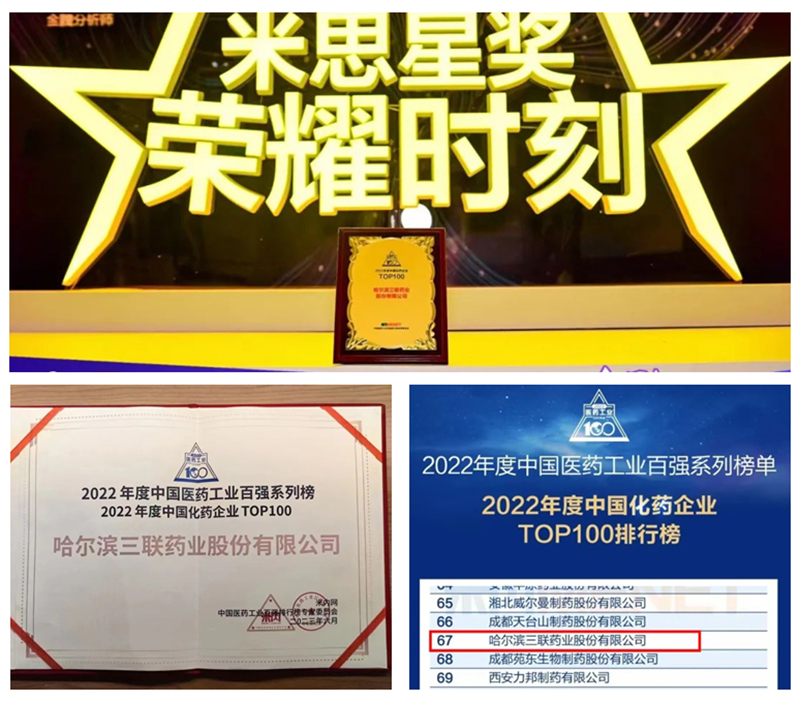 2023米思會于6月27日-30日在浙江湖州隆重舉行,會上,“2022年度中國醫(yī)藥工業(yè)百強(qiáng)系列榜單”重磅發(fā)布。哈三聯(lián)入選“2022年度中國醫(yī)藥工業(yè)百強(qiáng)系列榜單”,并位列“中國化藥企業(yè)TOP100排行榜”第67位,哈三聯(lián)華東大區(qū)總經(jīng)理申賀、江蘇區(qū)域經(jīng)理佟成功出席百強(qiáng)榜頒獎儀式,申賀先生代表公司上臺領(lǐng)獎。