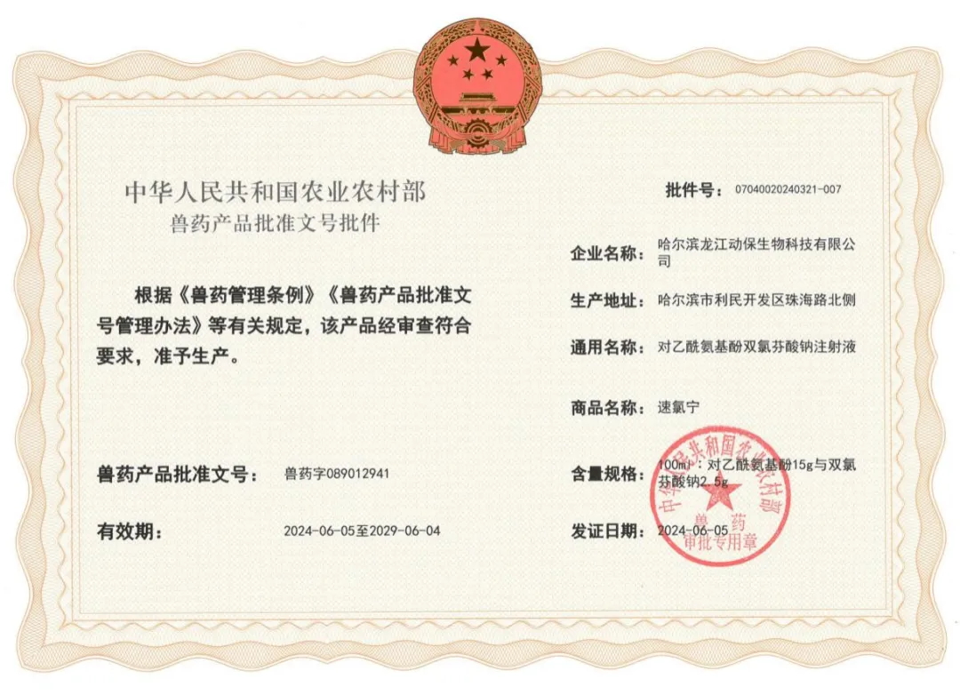 近日,哈爾濱龍江動保生物科技有限公司對乙酰氨基酚雙氯芬酸鈉注射液(100ml:對乙酰氨基酚15g與雙氯芬酸鈉2.5g)經(jīng)中華人民共和國農(nóng)業(yè)農(nóng)村部批準,成為國內(nèi)第二家通過該規(guī)格比對研究的企業(yè)。截至目前,龍江動保已有批準文號168個。