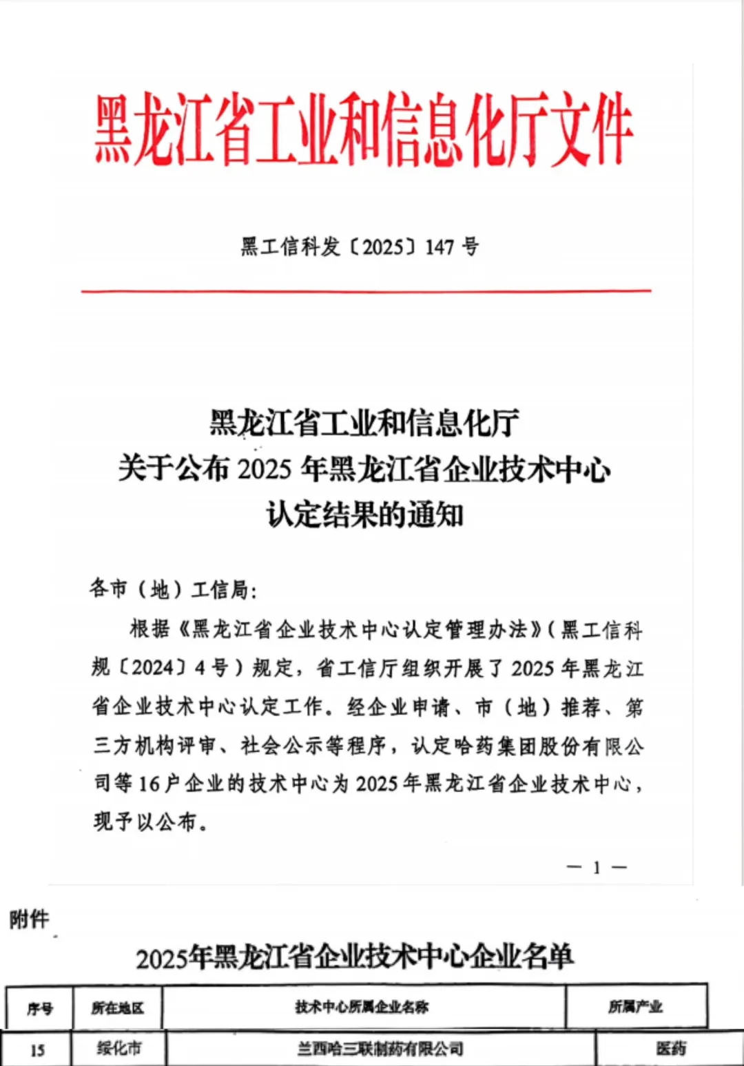 近日,黑龍江省工業(yè)和信息化廳公布2025年黑龍江省企業(yè)技術(shù)中心企業(yè)名單,哈三聯(lián)全資子公司蘭西哈三聯(lián)制藥成功入選。